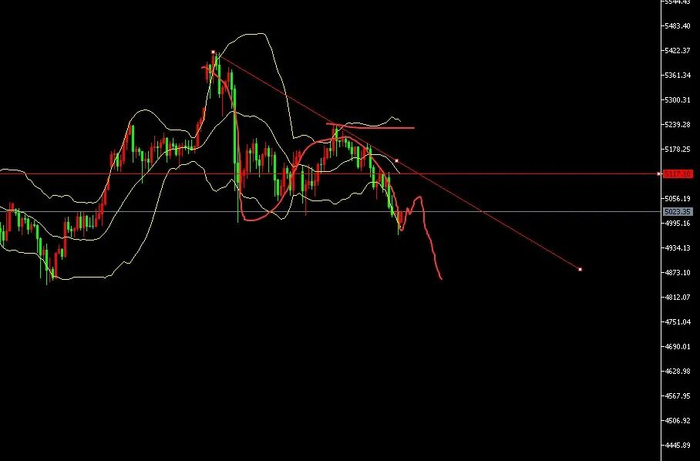 4小时图下跌通道局部形成,以5440和5240两个高点形成下行趋势线通道,击穿5000关口后打开进一步下跌空间,目前下行趋势线和布林道中轨处阻力重合。此位是今日的防守空点,小周期结构刚破位5000关口,短线还有进一步弱势延续。
